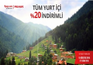 Pegasus Hava Yolları’ndan 15 Ağustos - 27 Ekim tarihleri arasında gerçekleştirecekleri yurt içindeki uçuşları için biletlerini 2 - 4 Ağustos tarihleri arasında alan misafirler, uçuşlarını yüzde 20 indirimli gerçekleştirecek.