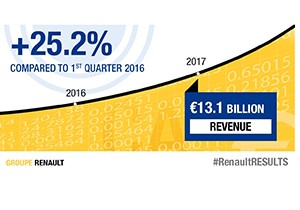 2017’nin ilk çeyreğinde, Grubun cirosu 13 milyar 129 milyon €’ya ulaştı (+%25,2). AVTOVAZ konsolidasyonunun etkisi hariç, Grubun cirosu yüzde 19,7 artarak 12 milyar 560 milyon € oldu (kur etkisi hariç +%18,4).