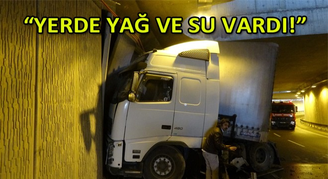 Kaza yapan tır şoförü Celil Hanmuhammedi, “Yerde yağ ve su vardı, çamurluydu yer biraz, kaydı. Kolum biraz ağrıyor” dedi.
