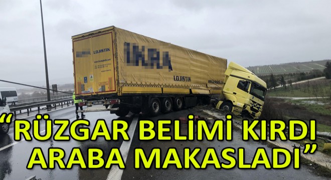 Kaza, Büyükçekmece TEM Otoyolu'nda Edirne istikametinde meydana geldi. Edinilen bilgilere göre, 01 CZN 41 plakalı tırın sürücüsü Rüstem Kemaloğlu, seyir halindeyken rüzgarın etkisiyle direksiyon hakimiyetini kaybetti. Direksiyon hakimiyetini kaybeden sürücü bariyerlere çarparak, yol kenarında bulunan toprak alana sürüklendi. Sürücü, yoldan geçen vatandaşlar tarafından tırdan çıkarılarak, polis ve sağlık ekiplerine haber verildi. Sürücü kazadan yara almadan kurtuldu. İhbar üzerine olay yerine gelen ekipler tırın çevresinde önlemi aldı.