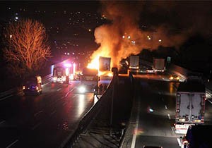 Çarpmanın etkisiyle alev alan tırın dorsesi yanmaya başladı. Tırın sürücüsü çekiciyi, yanan dorseden ayırarak güvenli bir yere yanaştırdı. Dorsede art arda 3 kez patlama meydana geldi.