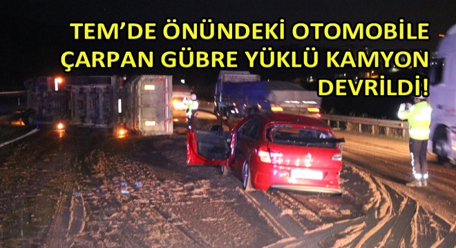 Bolu’da, TEM Otoyolu’nda önünde ilerleyen otomobile çarpan tavuk gübresi yüklü kamyon devrildi. Kazada, yaralanan olmazken otoyolda kilometrelerce araç kuyruğu oluştu.