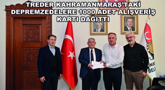 TREDER son olarak Ramazan ayında Kahramanmaraş’taki depremzedeler için Onikişubat Belediyesi’ne 1000 adet alışveriş kartı verdi. Onikişubat Belediye Başkan Hanefi Mahçiçek, TREDER tarafından yapılan yardım ile ilgili yaptığı açıklamada ‘’Bu ziyaret vesilesiyle TREDER, bin tane ihtiyaç sahibi ailelerimize dağıtmak üzere hediye kartı getirdiler. İşte bizim milletimizin güzelliklerinden birisi de bu. Özellikle Ramazanda paylaşmanın, yardımlaşmanın en güzel örneğini TREDER gösterdi. Biz de bunları ihtiyaç sahibi kardeşlerimize, belediyemiz kanalıya dağıtacağız. Ben kendilerine böyle güzel bir adedi devam ettirdikleri için, yardımlaşmanın en güzel örneklerinden birini icra ettikleri için çok teşekkür ediyorum.’’ şeklinde konuştu.