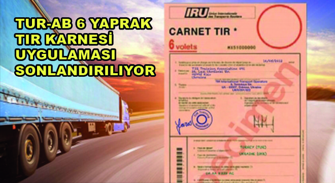 "Türkiye Odalar ve Borsalar Birliği tarafından yapılan duyuruda Uluslararası Karayolu Taşımacılığı Birliği'nden (IRU) alınan yazı doğrultusunda Türkiye ile Avrupa Birliği, EFTA ve Balkan ülkeleri arasında karşılıklı taşımalarda kullanılmak üzere çıkartılan yeni tip (TUR-AB 6 Yapraklı) TIR Karnesi uygulamasının beklenen talebi görmemesi sebebiyle 31 Ağustos 2020 tarihi itibarıyla sonlandırılacağı belirtilmiştir.