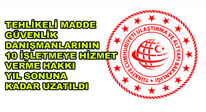 Ulaştırma Hizmetleri Düzenleme Genel Müdürlüğü Tehlikeli Madde Güvenlik Danışmanlığı Kuruluşlarında (TMGDK) istihdam edilen Tehlikeli Madde Güvenlik Danışmanlarının 31.07.2021 tarihinde sona eren 10 işletmeye hizmet verme hakkının, 31.12.2021 tarihine kadar uzatıldığını açıkladı.