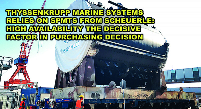 "We expressly decided in favour of SPMT axle lines from SCHEUERLE," explained Meik Philipps, Product Manager Submarines at thyssenkrupp Marine Systems. The purchase was preceded by a detailed market analysis of self-propelled transport modules providers for transporting high payloads. SCHEUERLE, a subsidiary of the german Transporter Industry International Group (TII Group), achieved high ratings in the relevant and separating categories. According to Philipps, this included the extraordinary technical quality of the SPMT axle lines (Self Propelled Modular Transporter) and, above all, the high service capability of SCHEUERLE as well as the high availability of the SPMT axle lines. “The competition simply was not at the same level as SCHEUERLE particularly when it came to service capability. Furthermore, the widespread use of SCHEUERLE SPMT axle lines clearly speaks for the manufacturer”, added Philipps.