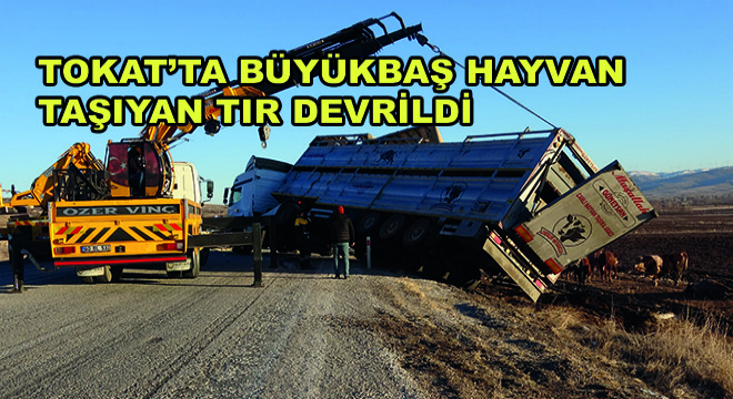 Ağrı’dan Amasya’ya kesimhaneye 35 adet büyükbaş hayvan taşıyan Müslüm Çoban idaresindeki tır devrildi. Yan yatan araçtan kendi imkanları ile çıkan sürücü kazayı yara almadan atlattı. Tırın iki katlı dorsesinin üst katında bulunan hayvanlardan bazıları gecenin karanlığında kaçarak gözden kayboldu. Tırın üst ve alt katında sıkışan hayvanlar ise Tokat Belediyesi itfaiye ekipleri tarafından kurtarıldı. Demir parmaklıklar kesilerek tırdan çıkarılan boğalar araziye dağıldı.