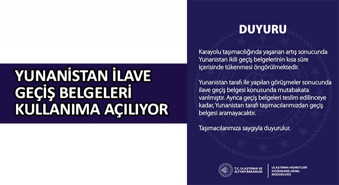 Ulaştırma ve Altyapı Bakanlığı Ulaştırma Hizmetleri Düzenleme Genel Müdürlüğünün açıklamasına göre, Yunanistan'dan temin edilen ilave geçiş belgeleri ülkemize ulaştırıldı. Buna göre, Yunanistan ile belgesiz geçiş uygulamasının sona erdiği açıklandı. Taşımacıların dağıtım bürolarından temin edecekleri ikili geçiş belgeleri ile taşımalarına devam edebilecekleri ifade edildi.
