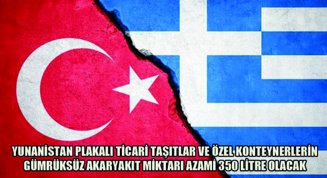 Yunanistan plakalı ticari taşıtlar ve özel konteynerlerin standart depolarındaki gümrüksüz akaryakıt miktarının azami 350 litre olması kararlaştırıldı.