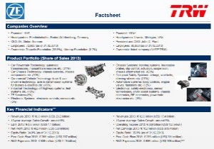 İki üstün başarılı teknoloji liderinin birleşmesi Her iki şirket, yakıt verimliliği, artan güvenlik gereksinimleri ve otomatik sürüş mega trendlerinde kabul görmüş şirketlerdir. ZF, şasi ve güç aktarma organlarında çok önemli bir aktördür bunun yanında TRW de gelişmiş sürücü destek sistemleri dahil olmak üzere, aktif ve pasif güvenlik teknolojileri alanlarında önemli bir tedarikçidir. Her iki şirket, müşterileri için yüksek ürün kalitesi ve sürekli yeniliğe dayalı hizmet anlayışını sunmaktadır.